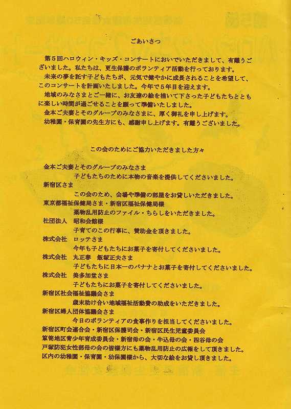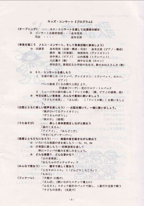 平成21年10月25日(日) 於 箪笥区民センター 0歳児から楽しめる本格的なコンサートとして、5回を数えます。 毎年ご参加下さる皆様には、楽しみにお待ちいただいたと思います。 回を重ねることでひろく皆様に愛される活動になり、おかげさまで 今年は420名を超えるお客様をお迎えできました。 多くの皆様に愛され、育まれたキッズ・コンサートは、誰でもが心か ら楽しめる音楽会として、今年は新宿区の広報にも載せていただき ました。 皆様の沢山の笑顔にお会いでき、会員一同、嬉しさで一杯です。 ありがとうございました。 |