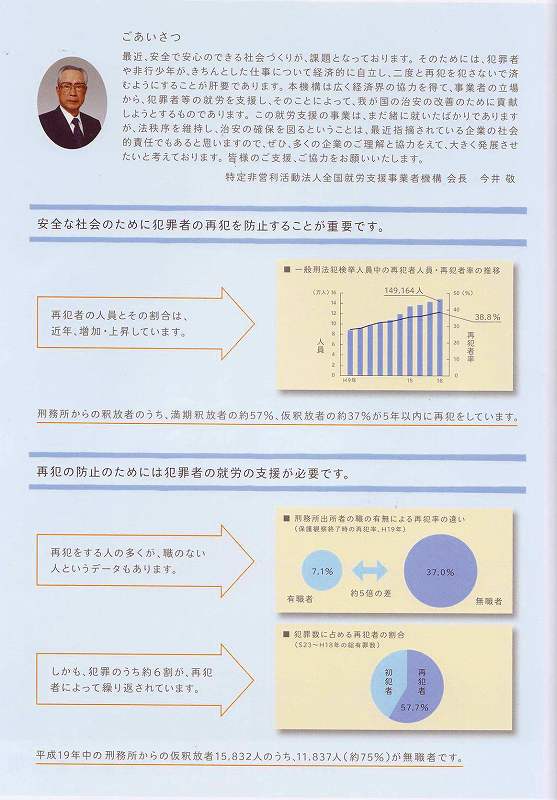 | NPO全国就労支援事業者機構は、経済界全体 の協力により、犯罪者の就労支援などを行ない、安 全な社会づくりに貢献しています。 経済界全体で我が国の治安改善のために協力す る初めての組織です。 その機構を支えていただく会員としての参加を、よ ろしくお願いいたします。 |