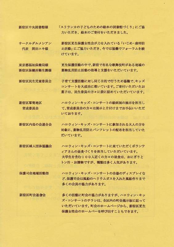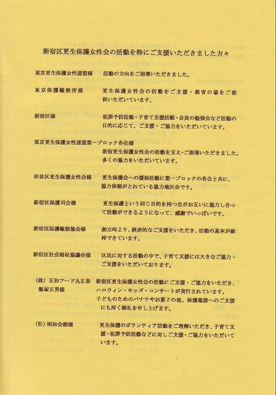 | 式典、および祝賀会には120名を超えるご参加を頂きました。 沢山の方に見守られ、育まれて今日があることを痛感します。 これまでのご支援に心から厚くお礼申し上げます。 昭和35年に新宿区更生保護婦人会が創立され、平成15年に 名称を女性会に変えて今年で50周年を迎えました。 全国で19万人の会員を数え、女性会綱領のもと、多くの会員が 様々な活動を展開しております。 新宿区更生保護女性会は50周年行事として、スリランカにある 養護施設「ガールズホーム」に読み終えた絵本を贈る活動をして まいりました。 多くの会員が地域を超えたつながりを持ち、関係諸団体と緊密 な連携、協働を重ねることで大きな成果が得られました。 皆様のご協力、温かいご支援のおかげさまと、感謝しております。 本日、皆様には会の足跡をご報告し、今後は気持ちも新たに様 々な活動に取り組んでまいります。 ご指導、ご協力を賜りますよう、よろしくお願い申し上げます。 |