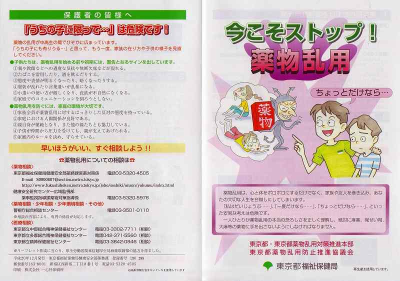 | 薬物乱用防止活動 平成21年7月13日 午後1時 於 新宿区牛込第二中学校 現在の社会状況から中学生を守るべく、各学年に分かれた勉強会、な らびに講演を以下にご報告いたします。 1年生は牛込警察の署員から、街中で襲われた時の防御法、また、自 転車、バイク利用のひったくり対策を実演を交えて教えて頂きました。 2年生は、NTTドコモの方から携帯を利用したトラブルの発生状況、適 切なサイト利用の指導を受けました。 3年生は73名が参加しました。平成18年度版高校生会議の「薬物乱 用防止」のビデオを見た後、 薬物乱用防止指導員である坂本会長と薬 剤師の井戸氏が、薬物の怖さを生徒に講演しました。 快感が得られる、やせる薬、等、あまりにも身近な薬物をこの場で再認 識し、身を守るための充実した授業でした。 |