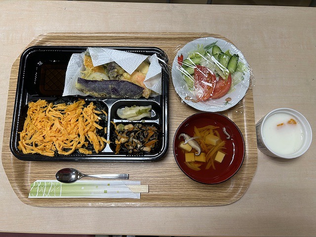 メニューは天ぷら(エビ、鶏肉、かぼちゃ、なす、しし唐、シイタケ、人参